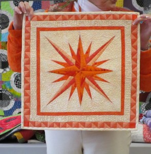 Phyllis Holmes, wearing a Fall Vest she made, shared a sampling of quilts and wall hangings she created over the years. Many “Ooohs” and “Ahhhs” were heard, as well as demands to “Vanna”, Jocelyn Muncaster, to walk the runway with the items, so all members could see more detail.