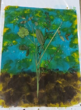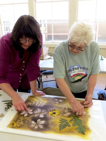Last Monday one of our newest members, Caroline Earhart, taught a class called “Sun Printing”. Upon seeing this technique used by Caroline in some of her quilts, we convinced her to teach a class for those who wanted to learn. Students spent time gathering leaves, sticks, ferns, branches, and bark before the class day, to put designs on fabric using solar energy.