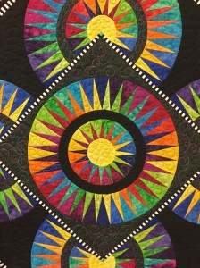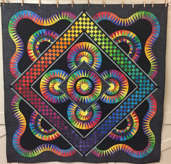 Waiting in line to sign in for the meeting, we noticed a flash of bright, swirling color straight ahead that made us smile. Even seeing the quilt from a distance, we were 99% sure of who made it. The 1% of doubt vanished after getting a closer look. We only knew of one quilter who would torture herself with precision paper piecing and perfectly set points on a pattern so fearsomely intense that you can’t look at it very long, unless you like feeling dizzy.