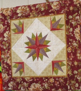 The quilt on the right, is from the Mariner’s Compass pattern by Judy Niemeyer, was one Diane made in a challenge posed by her hubby, Mike, who bet she could not make a quilt without using purple. Challenge met!