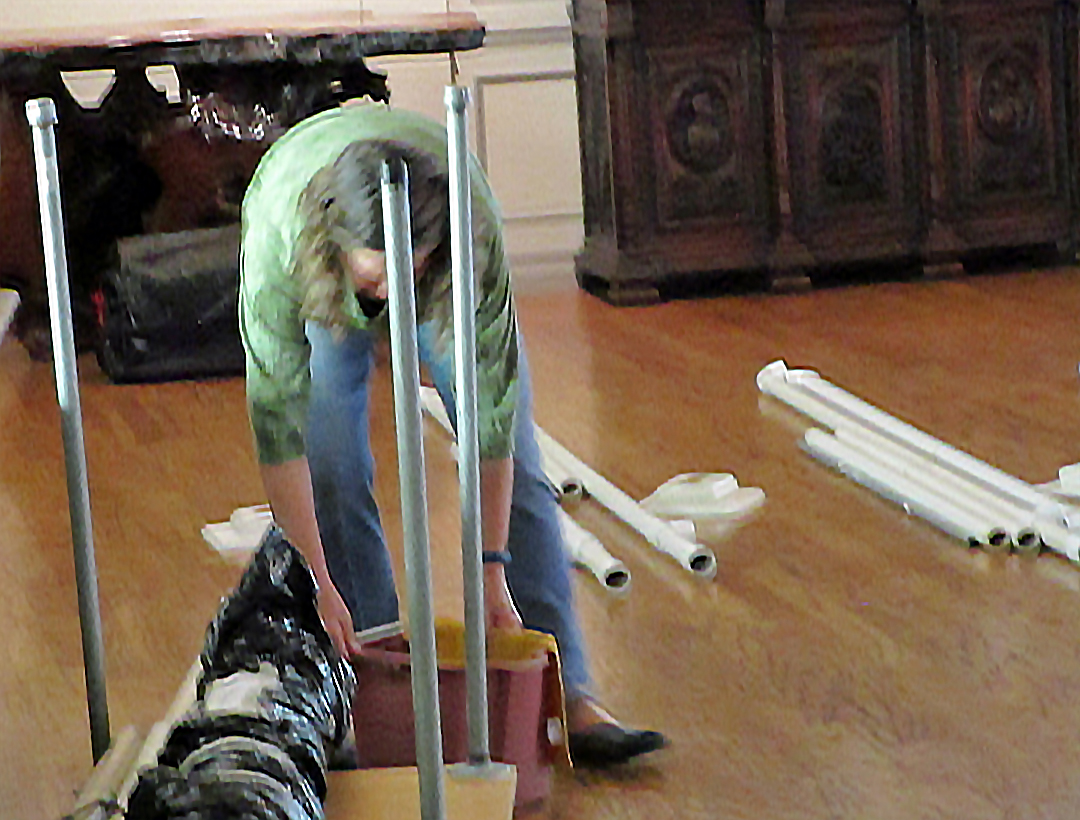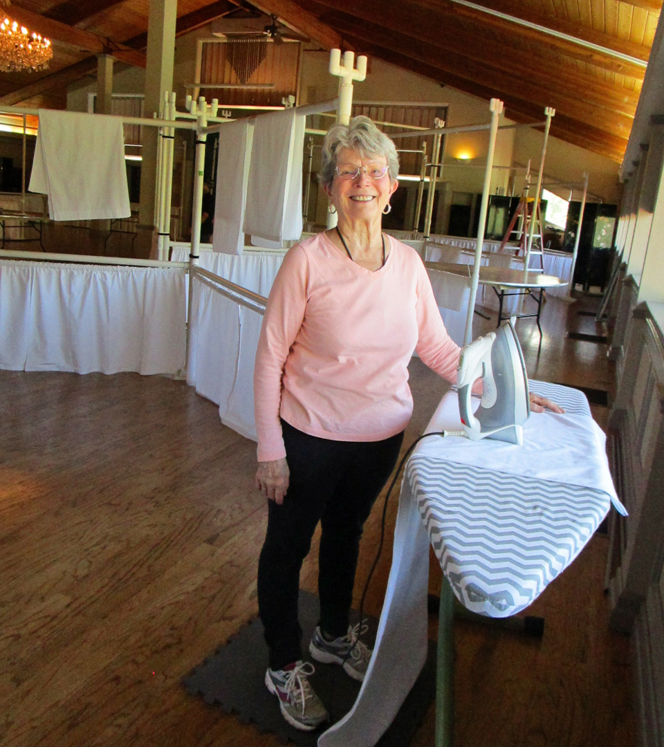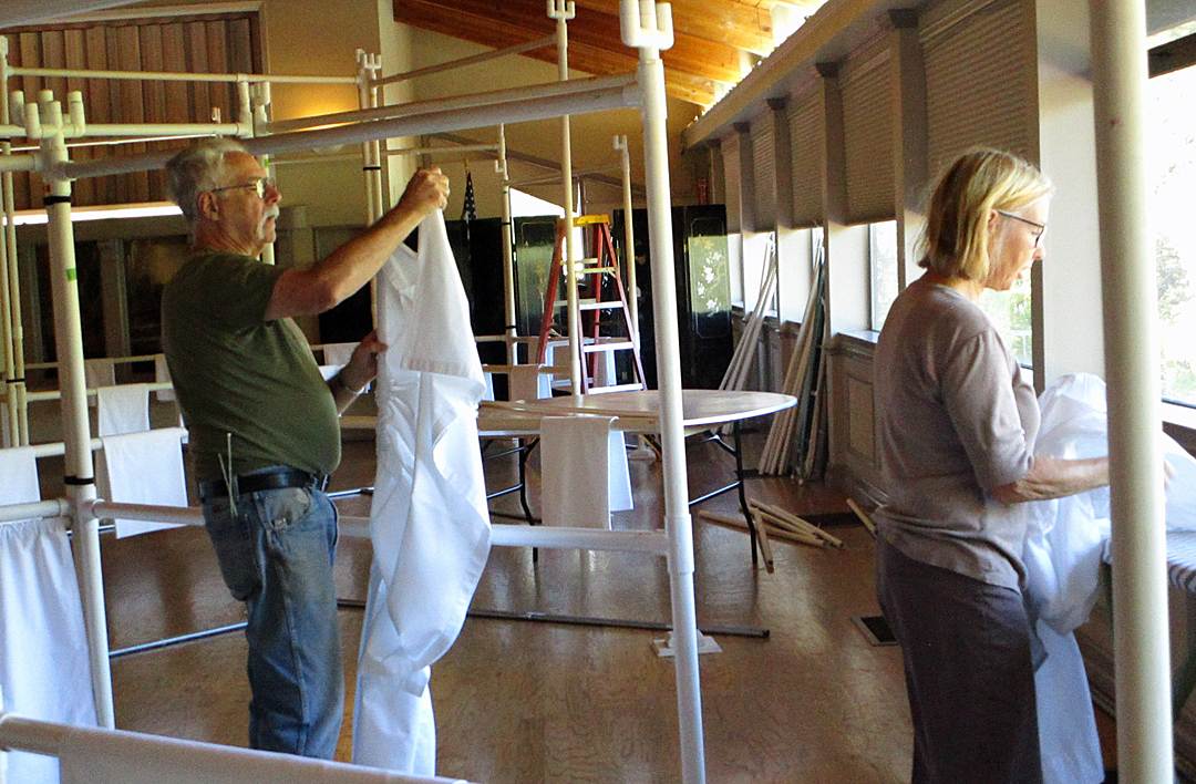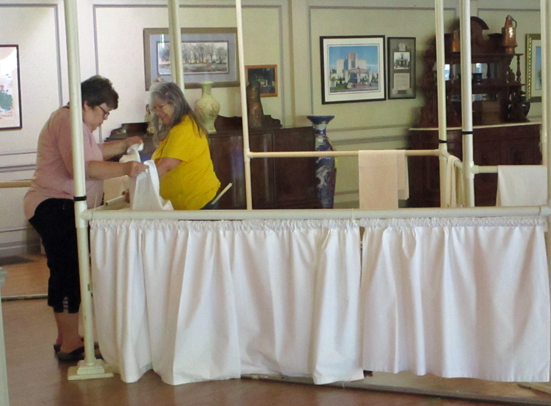 At 4:00pm on Sunday, the quilts are returned. The pins keeping the drapes in place are removed, then the quilts are removed from the frames and given to “catchers”, who take the quilts and fold them to hang back on the frame, with the ID tag showing.